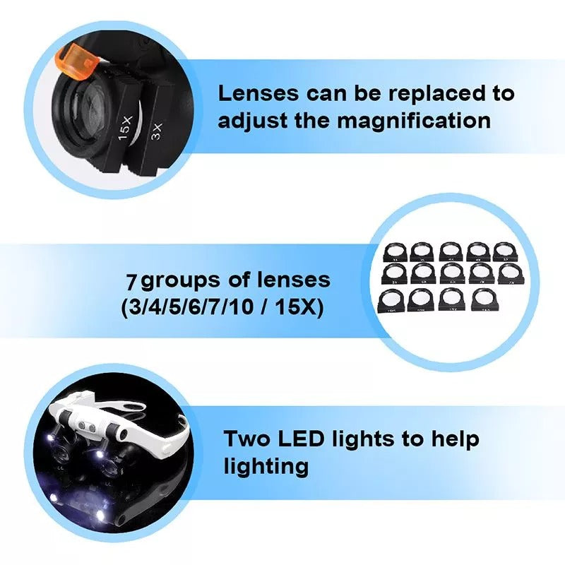 Our LED Headband Magnifier comes With 7 adjustable lenses of 3X, 4X, 5X, 6X, 7X, 10X, and 15X different magnifications, it can be combined into 21 kinds of combinations