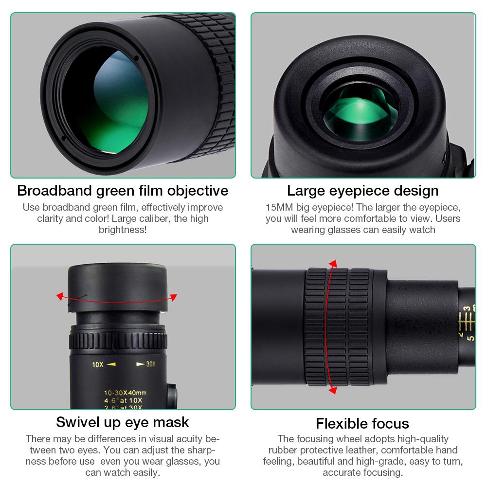Our monocular telescope upgraded 10X to 30X magnification, provide more wider, clearer and brighter scene in your eyes.